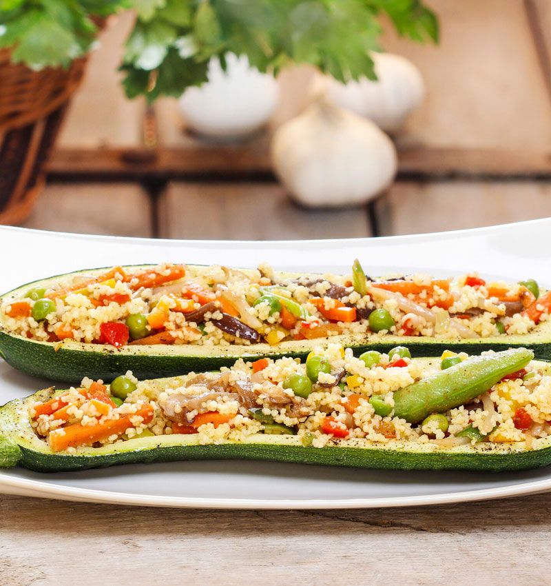 La carnosidad y la forma que tiene el calabacín son ideales para rellenarlos de los más variados ingredientes. Te proponemos una receta apta tanto para veganos como vegetarianos, en los que rellenamos esta hortaliza con un cuscús mezclado con distintos tipos de vegetales. Una plato perfecto y lleno de sabor.