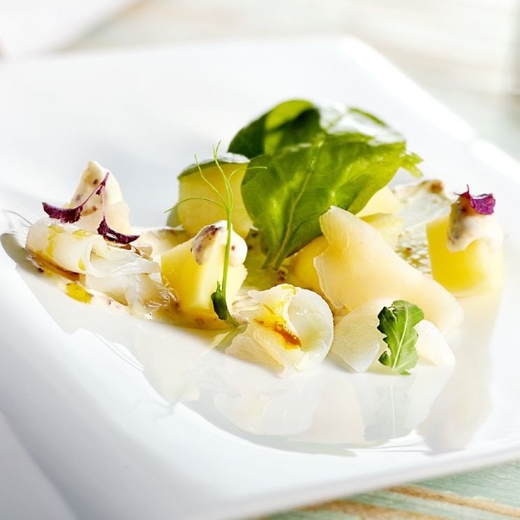 El trío culinario 'patatas+espinacas+bacalao' nos ofrece una de esas combinaciones gastro que funcionan siempre a las mil maravillas (caso, por ejemplo, de esos ricos potajes tradicionales). Berasategui se sirve de este sabroso 'triunvirato' para preparar una ensalada tan apetecible como diferente 'a lo de siempre'. En este caso, el cocinero vasco emplea bacalao ahumado y patatas cocidas, todo aderezado con una vinagreta hecha con mostaza, nata y aceite de cacahuete.