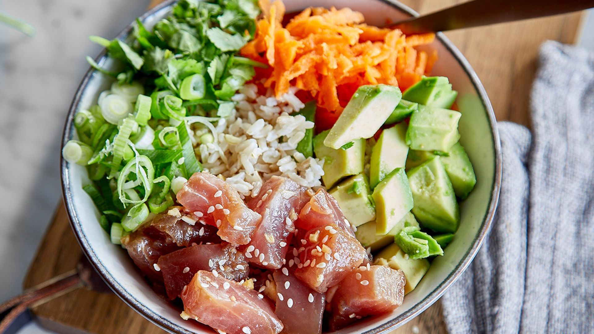 Por lo general, un poke bowl incluye una base de arroz, quinoa o fideos, proteína de pescado o vegetal, verduras, aguacate, edamame, algún aderezo y varios toppings. Y, dependiendo de lo que lleve, sus ingredientes nos aportan ácidos grasos omega 3, proteínas, carbohidratos, vitaminas A,C,D,E, B1 y B2, minerales como magnesio, potasio, calcio, fósforo y antioxidantes, etc. Tiene una gran capacidad saciante y por eso es perfecto como plato único.
