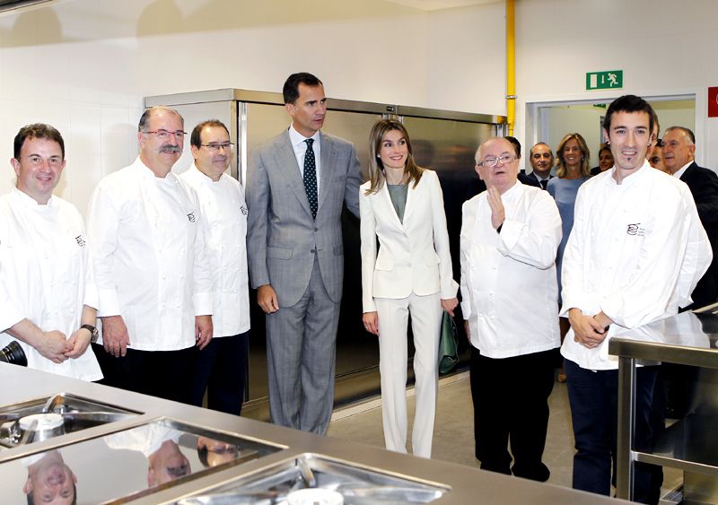 Un joven Enejo Atxa (primero por la derecha), junto con otros cocineros vascos de prestigio y con los entonces Príncipes de Asturias, en la inauguración en San Sebastián del Basque Culinary Center en 2011