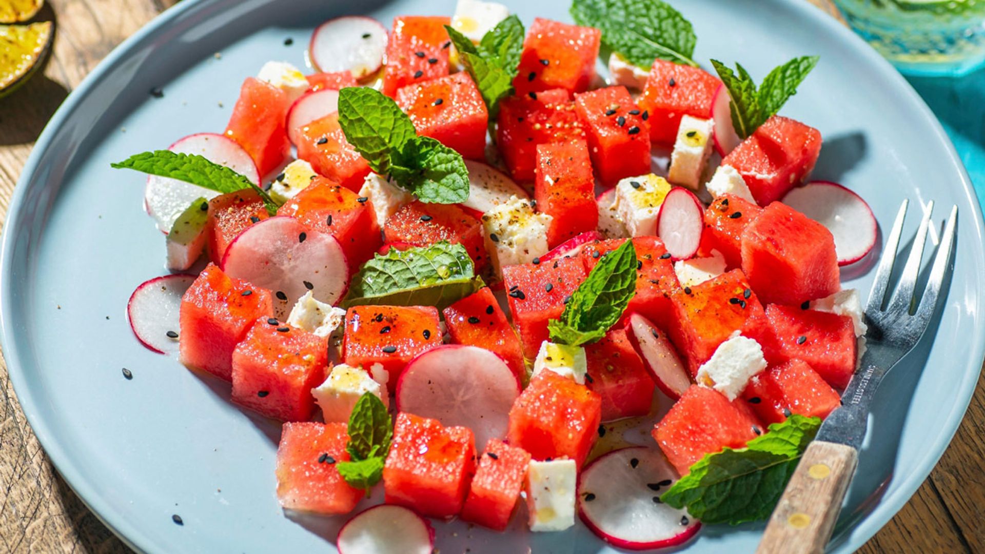 Su toque saladito hace una magnífica combinación con el dulzor de la sandía. Un tándem del que podemos disfrutar en distintas recetas: una de las más comunes son las ensaladas, pero también puede estar presente en aperitivos, sopas frías, postres….