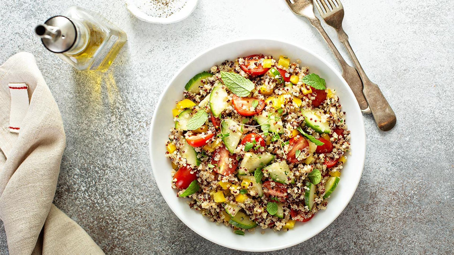 Esta ensalada es la versión ligera y refrescante del clásico tabulé, perfecta para las noches de calor. La quinoa, un superalimento rico en proteínas y sin gluten, se mezcla con pepino crujiente y las hierbas frescas de menta y perejil, que aportan un aroma y sabor únicos. Aliñada con limón y aceite de oliva, resulta un plato equilibrado, fresco y muy fácil de preparar, ideal para quienes buscan una cena saludable, nutritiva y llena de sabor sin complicaciones.