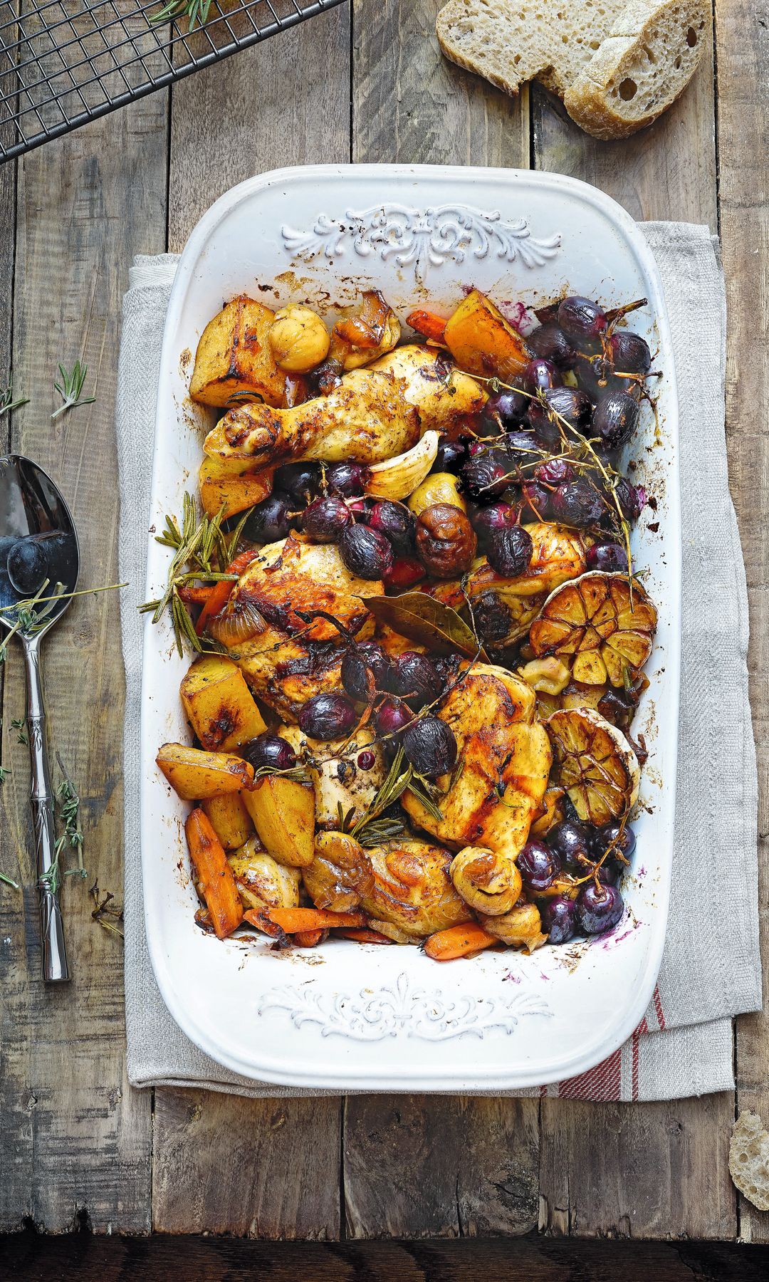- Combina y hornea. Coloca el pollo en una fuente, cubre con las verduras, añade las uvas, las castañas, el ajo partido y las hierbas. Riega con el caldo.
