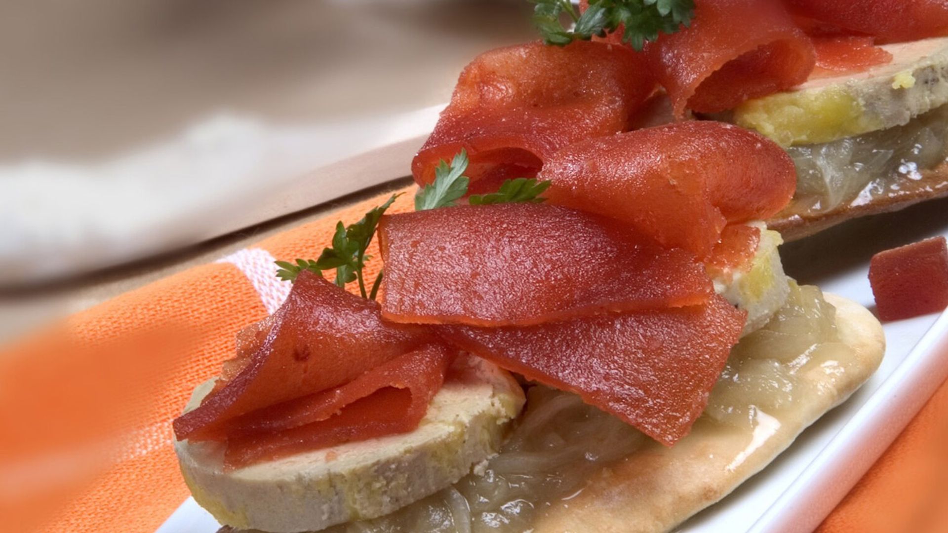 - Para la presentación del foie gras mi-cuit o cuit, lo mejor es la sencillez: con ayuda de un cuchillo, cuya hoja se habrá pasado previamente por agua caliente, córtalo en lonchas ni demasiado finas ni muy gruesas.