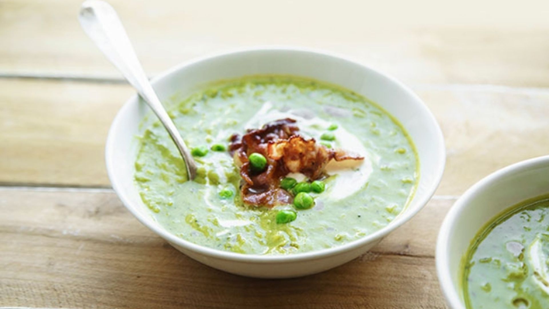 Una crema verde, dulce y muy agradable, con beicon crujiente para ese contraste que engancha.