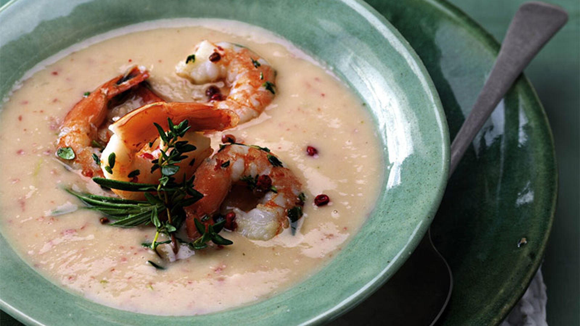 Judías blancas en versión fina y delicada, con gambas y pimienta rosa para un plato elegante y muy sabroso.