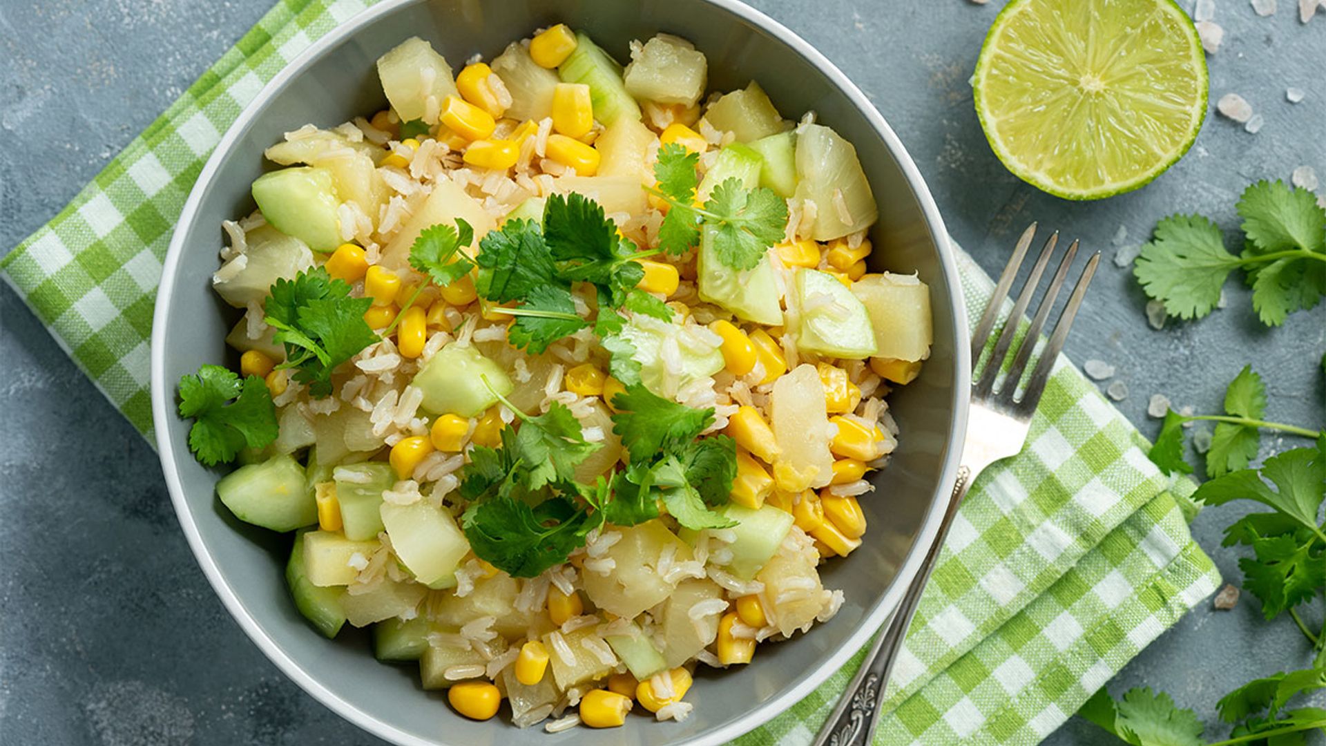 La textura firme del arroz integral -que además es más saludable y tiene un mayor poder saciante- contrasta aquí con la frescura del pepino y la piña y el ligero dulzor del maíz.