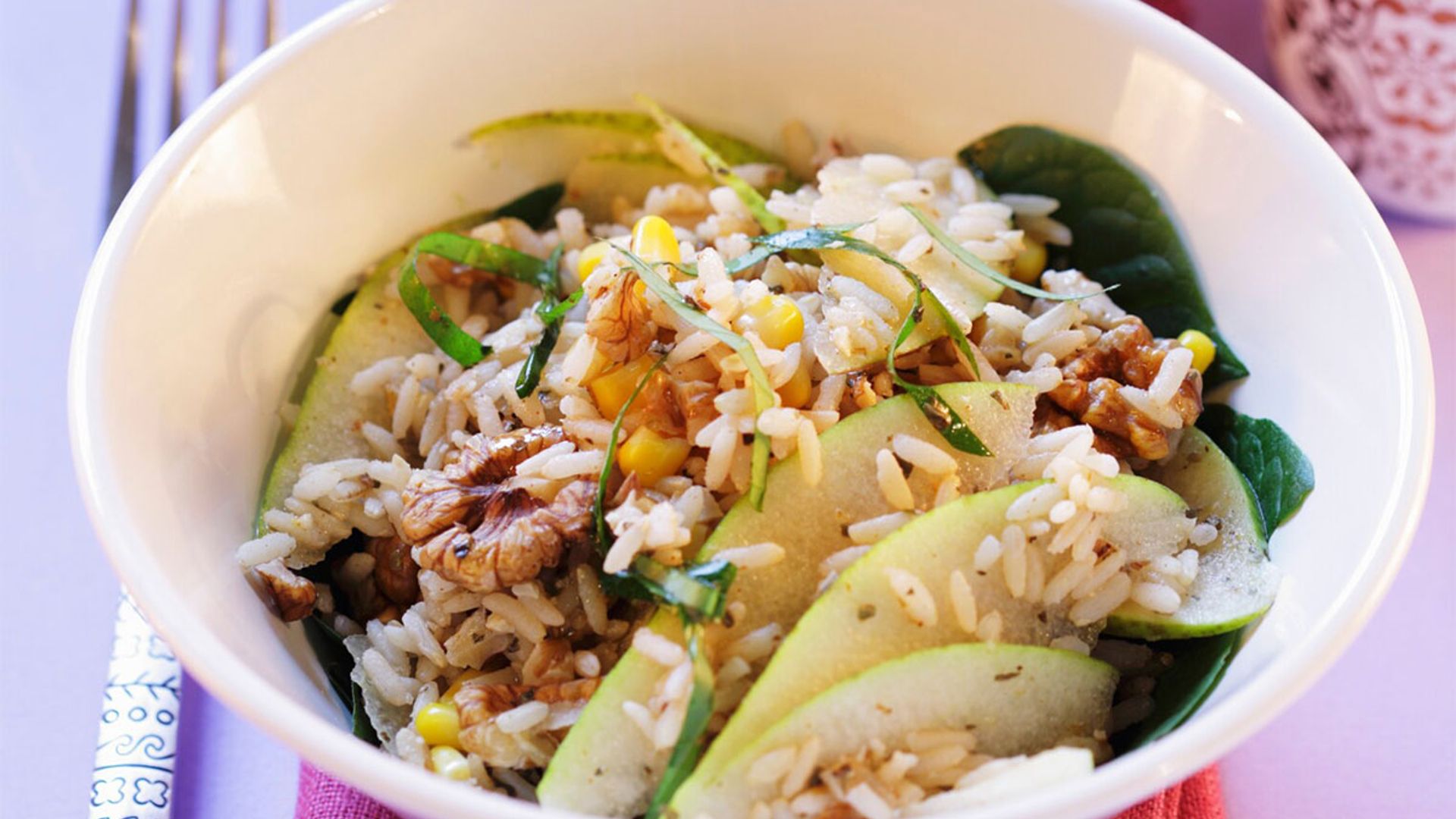 La ensalada de espinacas con pera y nueces -a la que se suele añadir también algún queso- es un clásico. Nos basamos en ella, pero la hacemos algo más contundente añadiendo arroz blanco cocinado en el microondas y un poco de maíz en conserva.