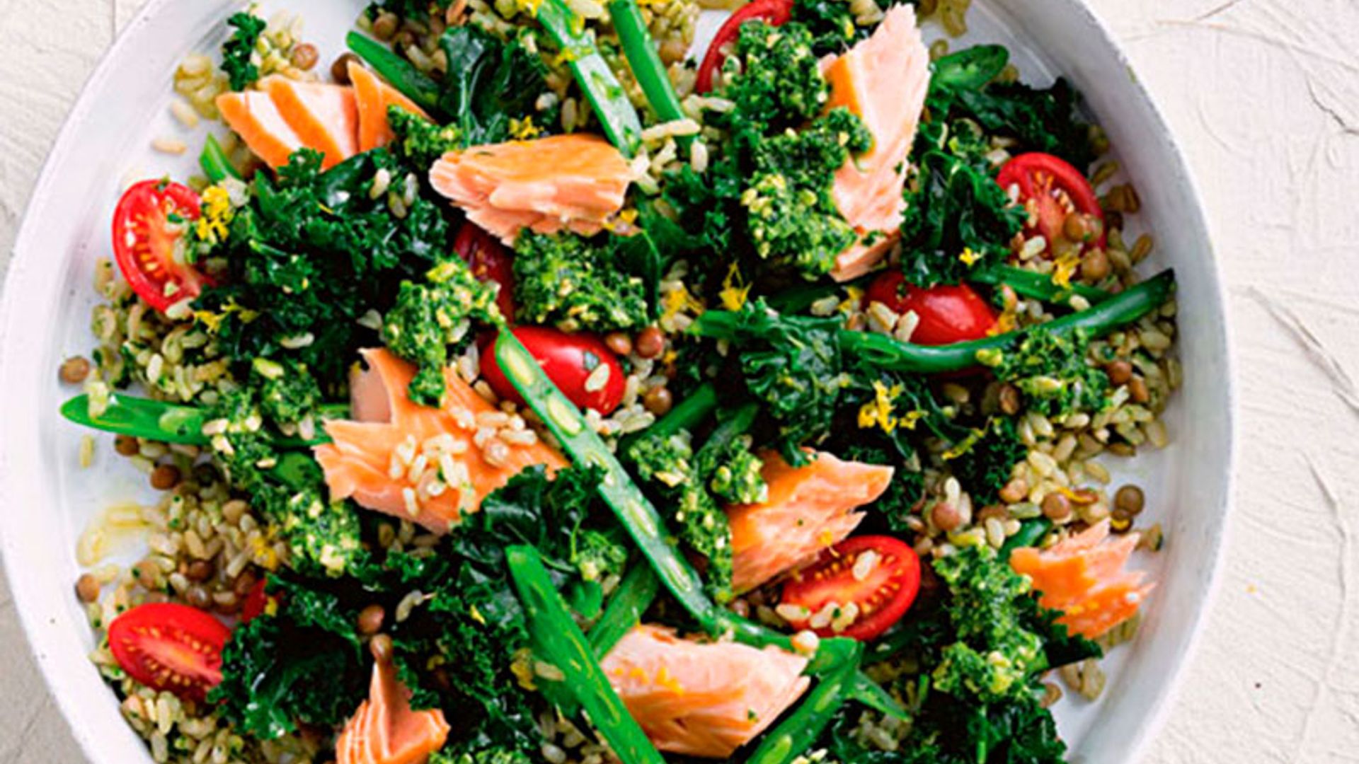 Una buena opción para tus ensaladas es mezclar arroz con legumbres. Nos encanta esta receta, supercompleta, con arroz, lentejas, salmón y el pesto de kale ¡que le da un toque delicioso!