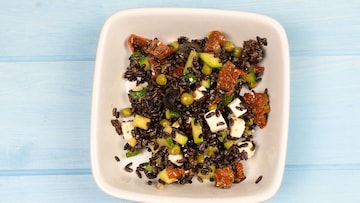 El arroz venere aporta un toque exótico, con notas a frutos secos, que combina con la suavidad del queso y la frescura de las verduras. Una ensalada con personalidad, rica en sabor y color.