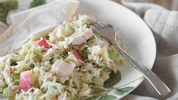Una ensalada de arroz se puede convertir en un plato único y de lo más completo. Esta podría ser uno de ellos, ya que, además de arroz -en este caso, de grano largo-, lleva pollo y vegetales como el apio y la manzana. La aderezamos con una ligera salsa de yogur y mostaza.