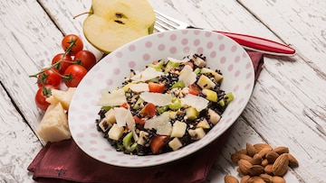 Otra opción con la misma variedad arroz, pero en este caso con manzana y frutos secos. Una ensalada con personalidad, en la que la fruta aporta frescura, las almendras un punto crocante y el parmesano un acabado ligeramente salado.