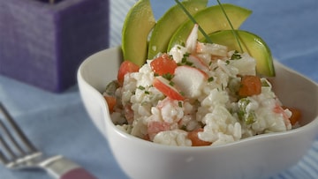 El surimi es un ingrediente que va muy bien en ensaladas -aunque no conviene abusar de él porque es un ultraprocesado, ya sabes-. La mezcla de arroz, aguacate, surimi, otros vegetales y mayonesa resulta superagradable.