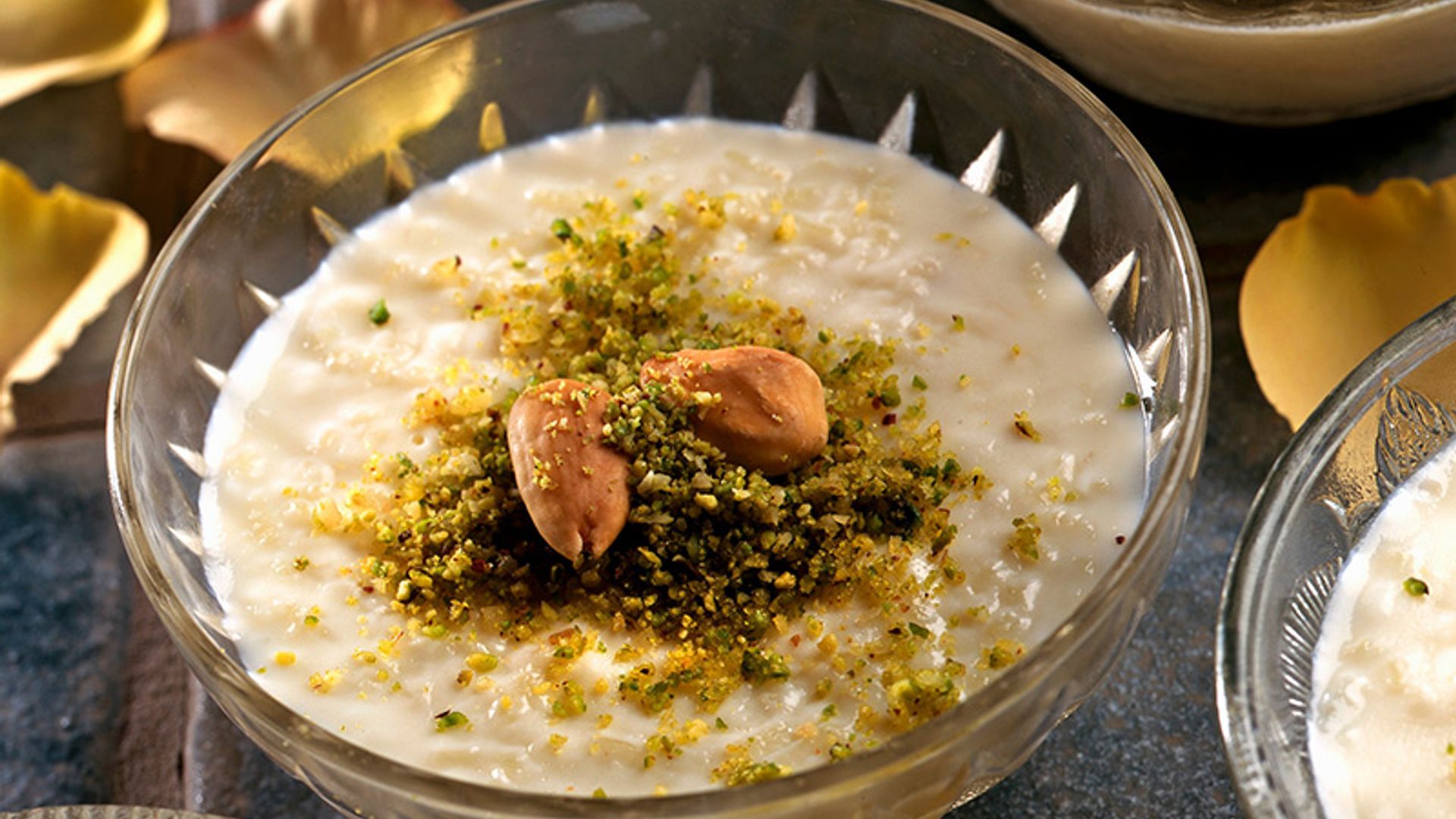 Arroz con leche con almendras y polvo de pistacho