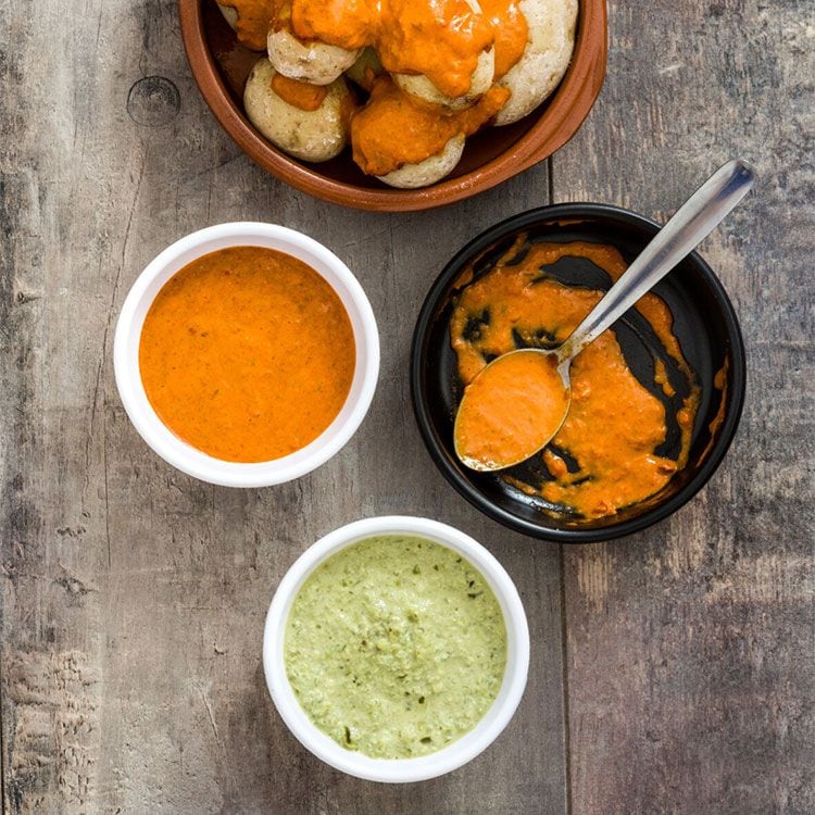 El mojo picón es la salsa más popular para acompañarlas, pero también se sirven con mojo verde o con ambos. La manera tradicional de prepararlos es en el mortero -aunque puedes lograr una textura más fina con la batidora-. Ambos llevan una base de ajo, vinagre, aceite, comino y sal. El rojo tiene, además, pimienta picona o guindilla y pimentón y el verde incorpora cilantro fresco. La proporción de cada ingrediente dependerá si te gusta más o menos fuerte de sabor.
