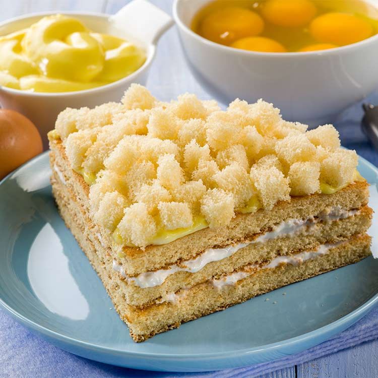 La tarta mimosa se cubre con cuadraditos de bizcocho que simulan la apariencia de la flor de la mimosa.