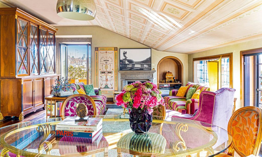 Viola ama el color. De hecho, la casa está pintada al fresco como las antiguas villas romanas. “Nunca tengo casas blancas. Me gusta combinar colores y utilizar distintos tejidos, rayas, estampados…”