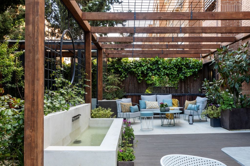 Su ubicación concede más protagonismo a este elemento que hace especial el jardín al llevar la presencia del elemento agua. Se trata de un estanque que aporta frescor y permite disfrutar del sonido del agua fluyendo. Algo muy relajante y que genera bienestar. Se apoya en la pérgola de madera, con un enrejado decorativo sobre él. Y además, el suelo también cambia entre la zona de comedor y estar, de manera que en un tono más oscuro, la estructura blanca del estanque resalta. El trabajo de cerrajería es de TCI.