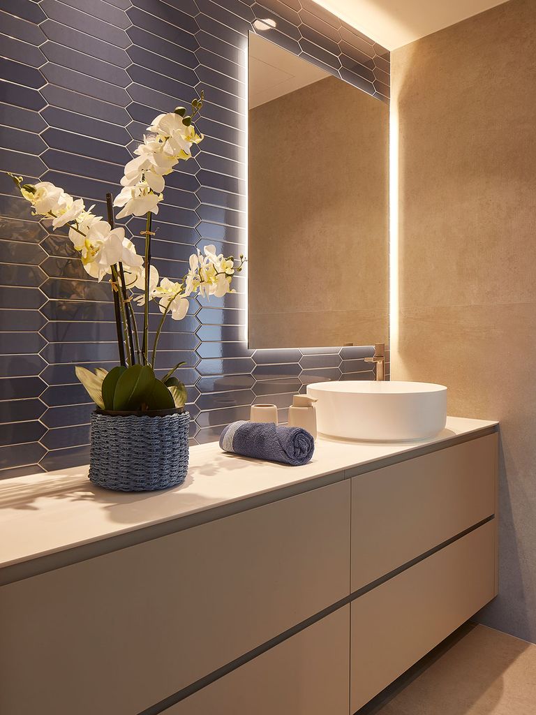 En este caso, se buscó plasmar la esencia mediterránea y un toque distintivo a través del uso de azulejos en pequeño formato, de Cifre Cerámicas, en color azul marino. El mueble, hecho a medida, ofrece una gran capacidad de almacenamiento, mientras que la superficie en Corian y el lavamanos sobre encimera, del mismo material, aportan elegancia y funcionalidad. Las griferías en acabado bronce de la firma Ritmonio completan este baño tan especial.