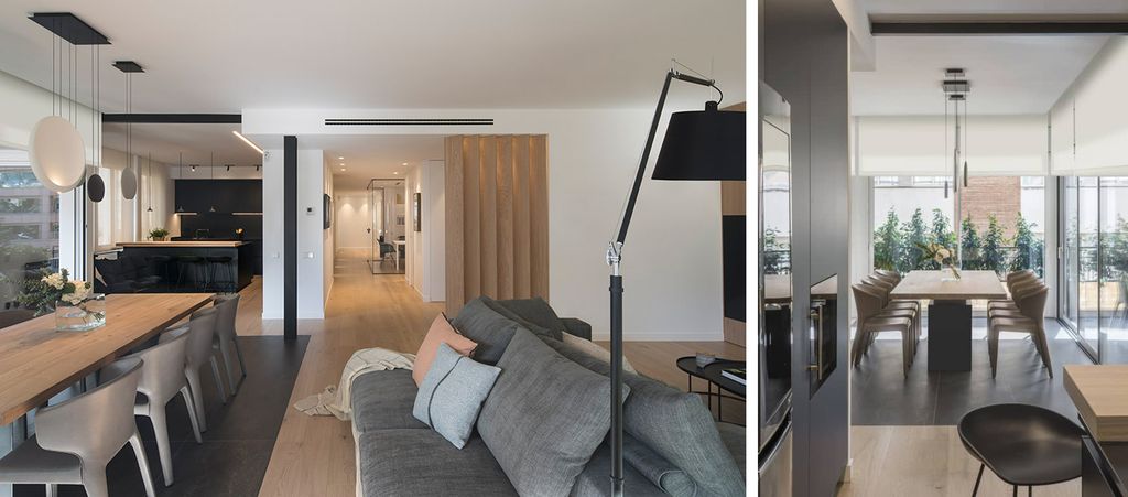 Por último, el outdoor living es una tendencia al alza y en este proyecto se manifiesta con el empleo del suelo. En la reforma que firma la interiorista Susanna Cots cocina, comedor y salón forman un ambiente diáfano sin puertas ni interrupciones y es el comedor el que se encuentra junto a la terraza, por lo que para marcar esa integración entre interior y exterior comparten el pavimento, un cerámico negro de la firma Todagres. Mientras que en la cocina y el salón se apuesta por un parqué de Kährs.