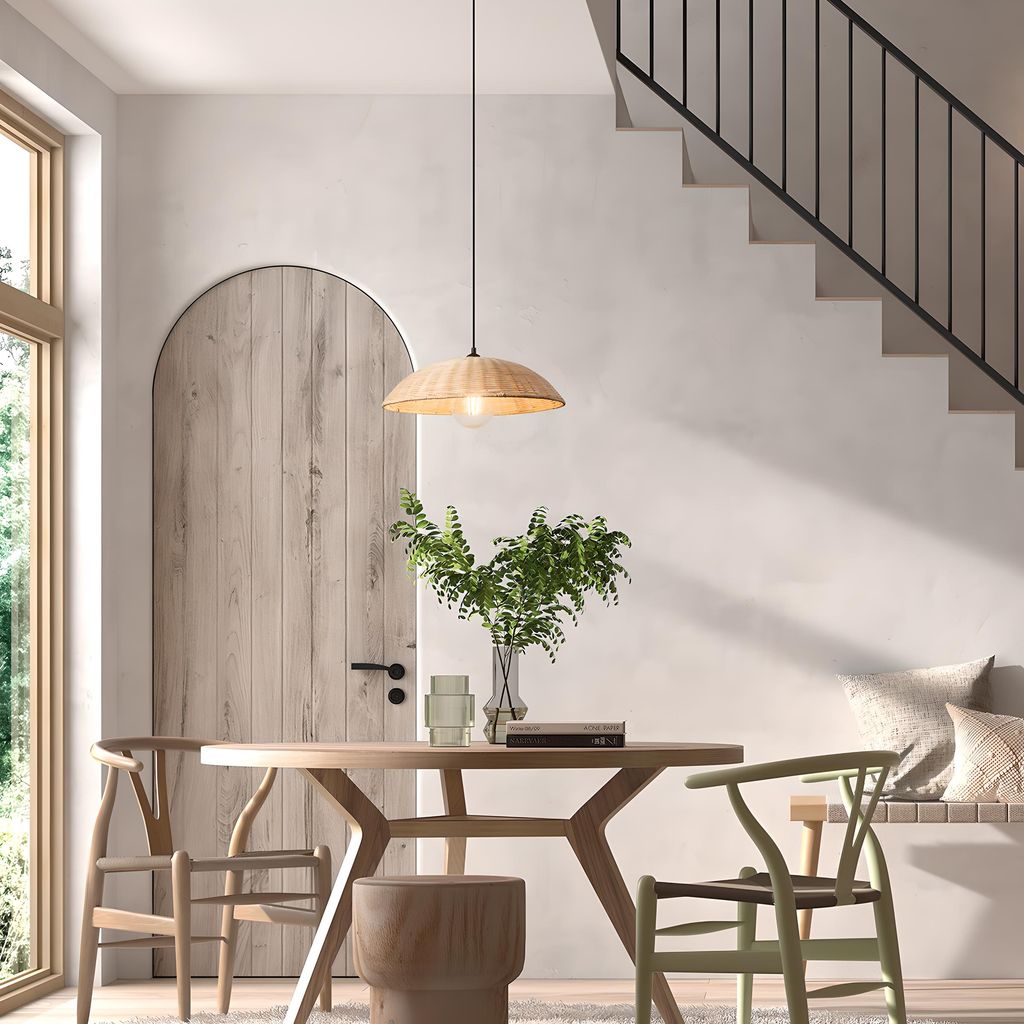 Una buena forma de acertar con la lámpara del comedor es buscar un nexo con algo que ya esté presente en el espacio. Puede ser un color, una textura o un material. En este caso, el hilo conductor es la fibra natural, que aparece tanto en las sillas como en las lámparas. Ratán, mimbre o bambú aportan calidez, textura y un punto artesanal que funciona muy bien en comedores de estilo mediterráneo, bohemio o nórdico. Y lo mejor: es muy agradecida a nivel decorativo.