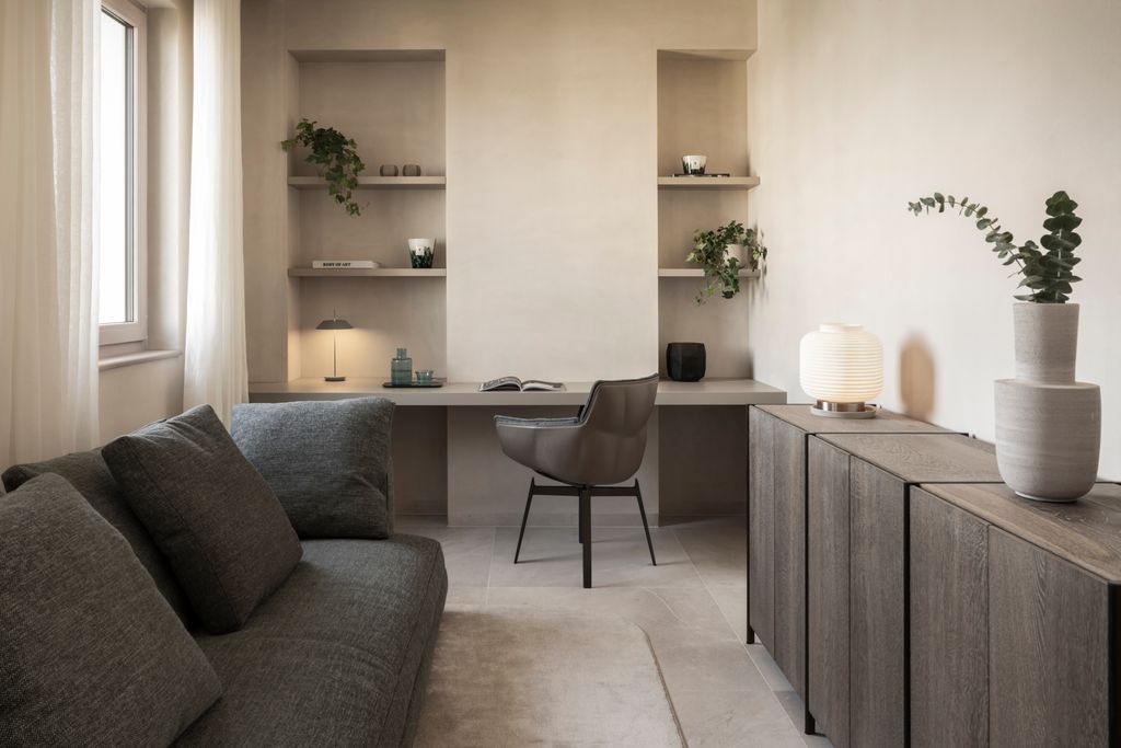 Este ambiente ha sido concebido como un espacio polivalente: despacho y habitación de invitados, cuando se necesita. Para lograrlo, se ha optado por soluciones modulares y mobiliario ligero, que permiten reorganizarlo con facilidad sin perder armonía visual. La iluminación puntual y las piezas a medida aseguran la versatilidad.