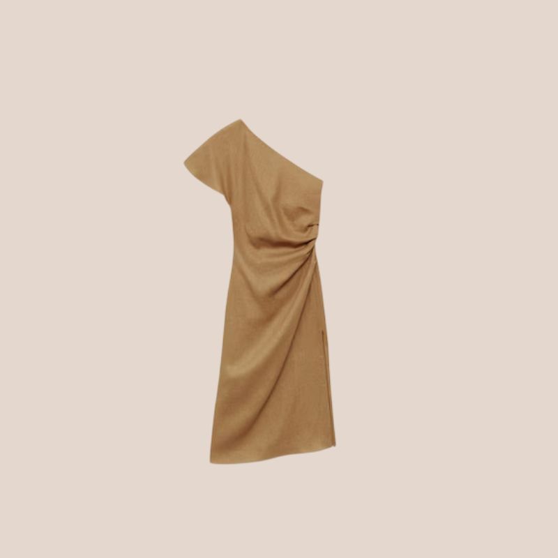 Es una de las siluetas que más éxito tienen entre los vestidos de invitada de primavera. Inspírate con este diseño asimétrico de Mango (49,99 euros), con un favorecedor drapeado lateral. Puede ser perfecto para una boda de mañana o para una cena romántica.
