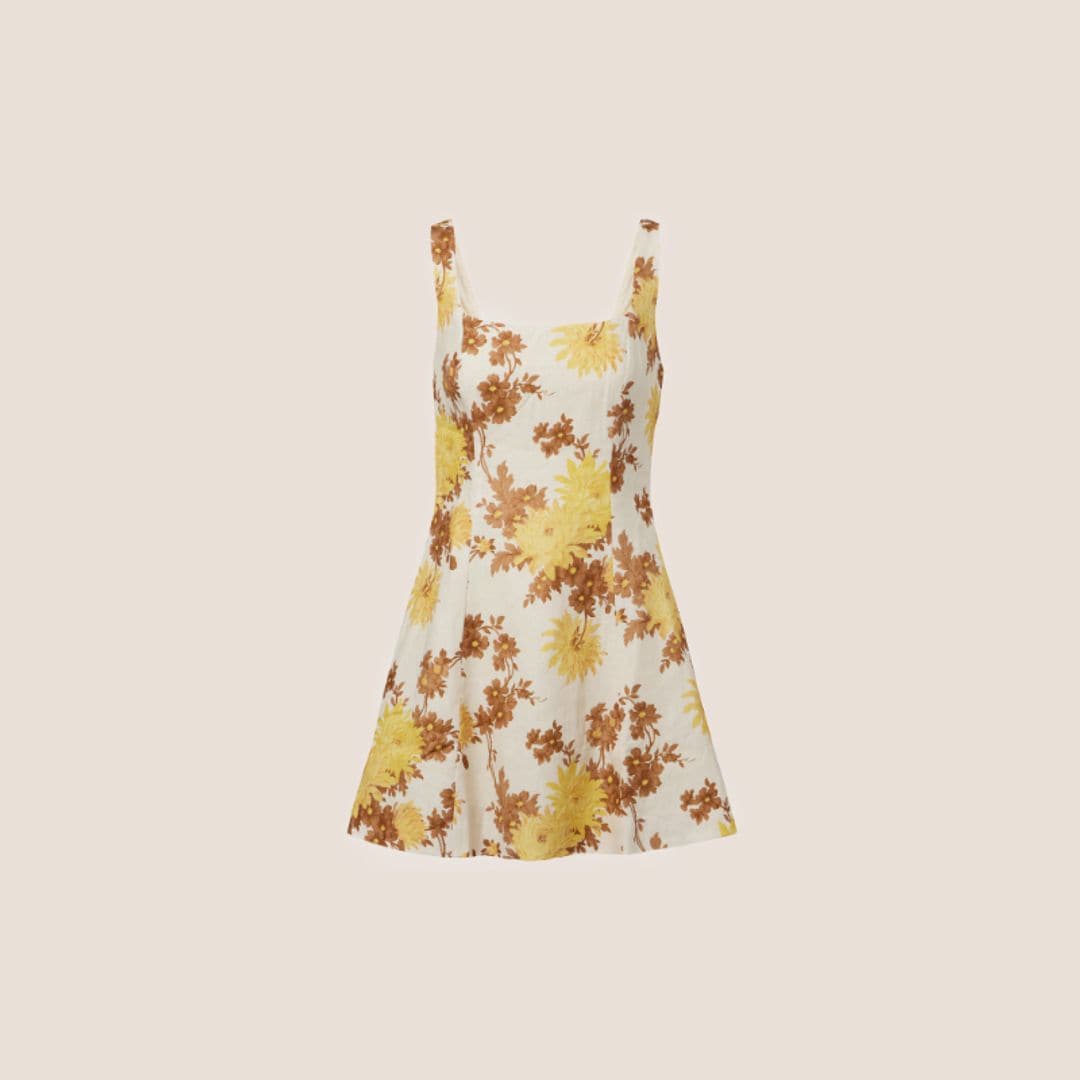 De largo mini y silueta patinadora, confeccionado en lino grueso con estampado floral bicolor, de Faithfull (260 euros).