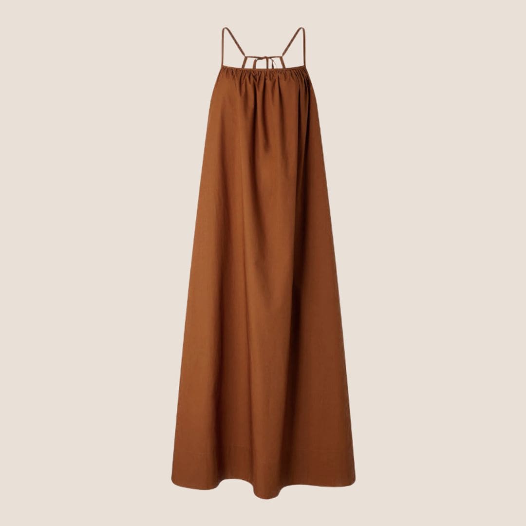 Con cuerpo recto, escote cuadrado y espalda abierta con lazo ajustable en lino 100%, de Posse (430 euros).