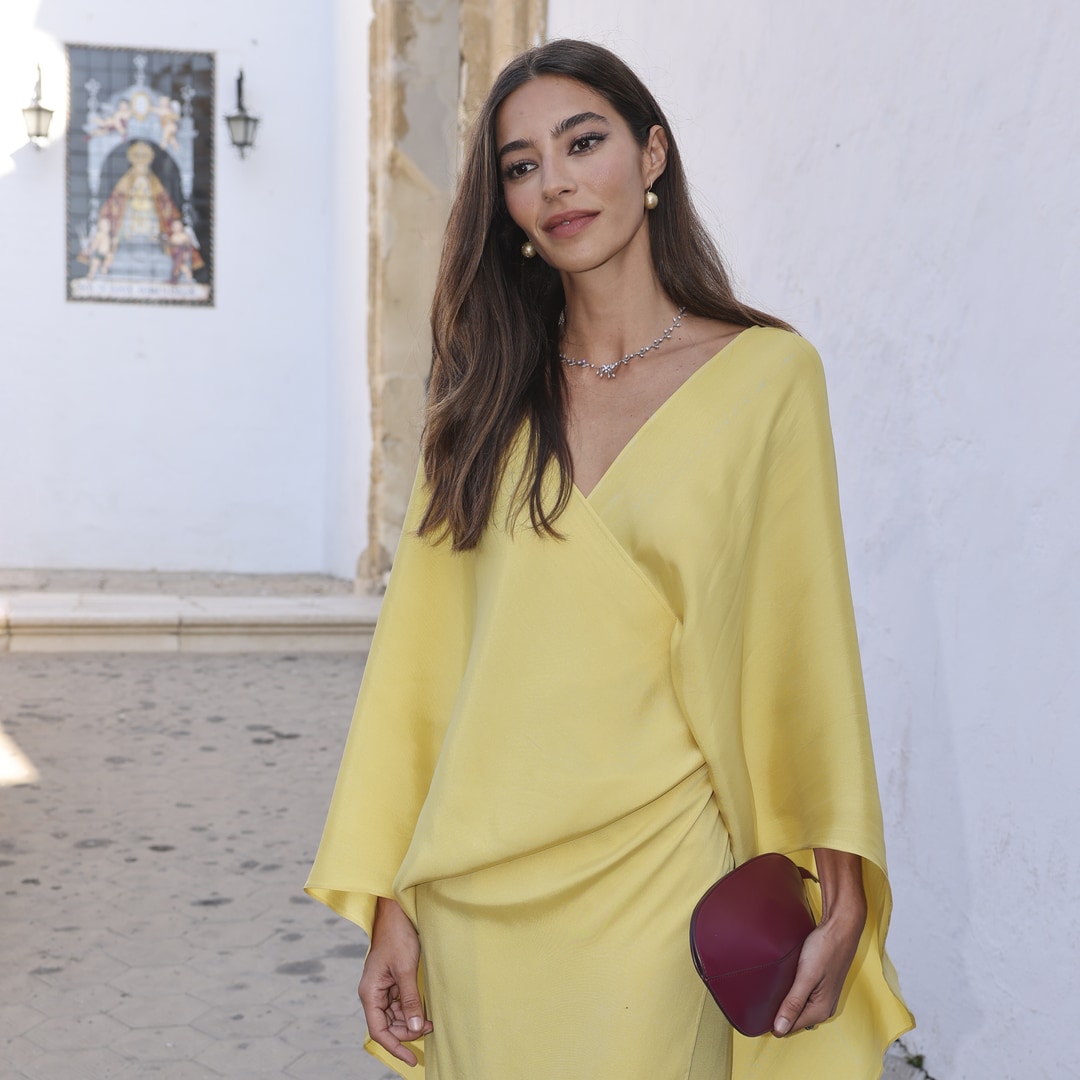 La modelo viajó de Nueva York, donde vive desde hace años, hasta Sanlúcar de Barrameda para asistir al enlace de su hermano y Blanca Llandres, que se dieron el 'sí, quiero' el 18 de octubre. Para la ocasión escogió un luminoso diseño en amarillo suave de la firma Sybilla, un vestido de corte fluido y escote en V con silueta envolvente y mangas amplias. Un look minimalista que acompañó con accesorios más vistosos, como un clutch burdeos y sus zapatos de tacón en tonos coral y turquesa.