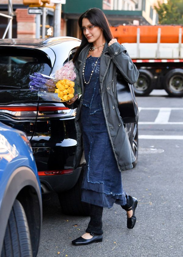 Más que sonriente posaba Bella frente a los paparazzi, sosteniendo en brazos el triple ramo de rosas amarillas, rosas rosas y lavanda. Acompañada por su novio, salía a las calles neoyorquinas con un look cómodo y rompedor formado por un trench verde, un vestido de tejido vaquero y lo que parecen ser calentadores de lana, un (controvertido) accesorio que ha llevado en otras ocasiones últimamente. En los pies, el zapato plano que ha vuelto este otoño: las bailarinas de estilo Mary Jane.