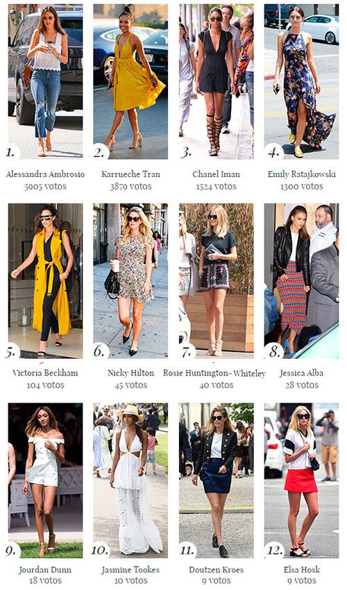 Tras ella, ganadora de la votación con 5.905 votos (de los 12.871 totales), le siguen Karrueche Tran (3.879 votos) con un vestido amarillo y unas sandalias a tiras de color nude; Chanel Iman (1.524 votos), luciendo un LBD y sandalias tipo gladiador; Emily Ratajkowski (1.300 votos),con un maxivestido azul con estampado floral y mocasines dorados; y cerrando el top five, Victoria Beckham (104 votos), que luce un conjunto de raya diplomática con un maxichaleco amarillo y sandalias a tiras.