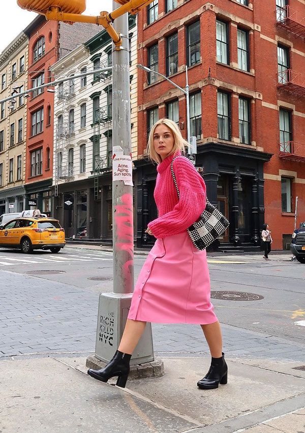 A principios del otoño las expertas en moda nos enseñaron los mejores looks para enamorarnos del rosa, un color que promete arrasar esta temporada. Estilismos con los que mantener la magia del verano con prendas ideadas para protegerte del frío entre las que destacan los jerséis de punto con mangas abullonadas que han conquistado a las expertas en moda. La influencer Naaomi Ross conjuntó esta pieza con una falda midi de cuero en un tono más chicle, botines negros y bolso de perlas estampado.