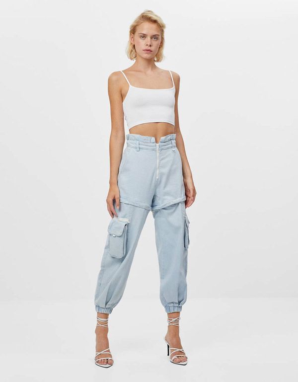 La inspiración de este llamativo diseño (que cuesta, 45,99€), está claramente ligada tanto al estilo militar y safari como a la ropa que llevan los montañeros. Y posiblemente algún hombre de tu familia (tu padre, tu tío, tu hermano...) llevara, hace casi 20 años, un pantalón de este tipo, ya que fueron tendencia a finales de los años 90 y principios de los 2000. Eso sí, en ese momento fue la moda masculina quien los encumbró (no sin polémica entre quienes lo adoraban y quienes lo odiaban), mientras que hoy parece que también van a colarse en los armarios de las chicas. La propuesta de Bershka, en un tejido denim muy claro -genial para el verano- y con detalles en blanco, ya está generando comentarios en la red. ¿Te apuntarías a llevar este práctico '2 en 1', o eres de las que prefieren las bermudas y los jeans largos por separado?
