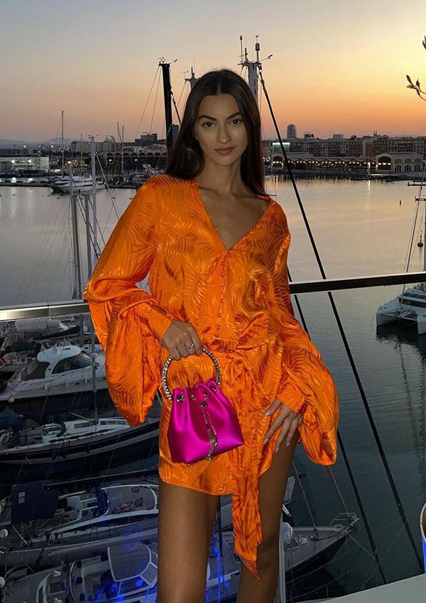 Ambas quisieron sumarse a una de las tendencias que han regresado con fuerza este verano: aplicaron la técnica del color block a sus looks, es decir, vestir completamente de un color añadiendo tonos complementarios, como han hecho con sus accesorios. Meri Lozano llevó un vestido corto satinado de la firma Rat & Boa, un diseño abotonado con mangas globo y lazo en la cintura, con un estampado muy veraniego. La manga larga, a pesar de las altas temperaturas, fue todo un acierto. Y es que la preboda de Teresa Andrés Gonzalvo se llevó a cabo en el puerto de Valencia por la tarde, junto al mar, como pudimos apreciar después en la foto detalle del look de la influencer.