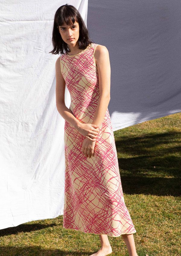 Se trata de un modelo muy sencillo que, sin embargo, tiene ese 'je ne sais quoi' que le hace imposible pasar desapercibido. Una pieza de Clea Stuart que ha sido confeccionada en España a partir de un tejido jacquard de seda y algodón con detalles de lúrex en las líneas rosas que surcan la prenda. Un original estampado sobre fondo amarillo que recuerda a las redes de las telas de arañas (algo que hemos deducido al conocer su nombre, The Spider Dress).
