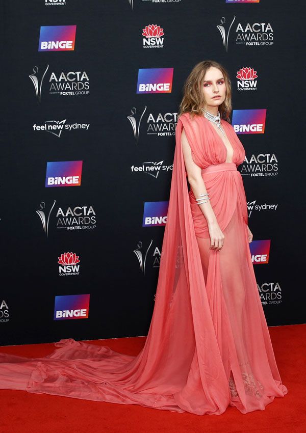 Gracias a este papel acaba de ganar el galardón cinematográfico más importante de Australia, el premio a la mejor actriz de reparto en los AACTA Awards por su papel como esposa del rey del rock and roll en una película, dirigida por Baz Luhrmann, que no le deja de dar alegrías. Así, para este gran evento, se decantó por un diseño con transparencias y drapeado de Gucci en color salmón, con una gran cola y con un gran escote muy favorecedor. Un vestido algo complicado de llevar y que le hizo necesitar ayuda al subir a recoger el premio. La actriz combinó este espectacular vestido con joyas de diamantes de Bvlgari y unos zapatos con estampado animal de serpiente.