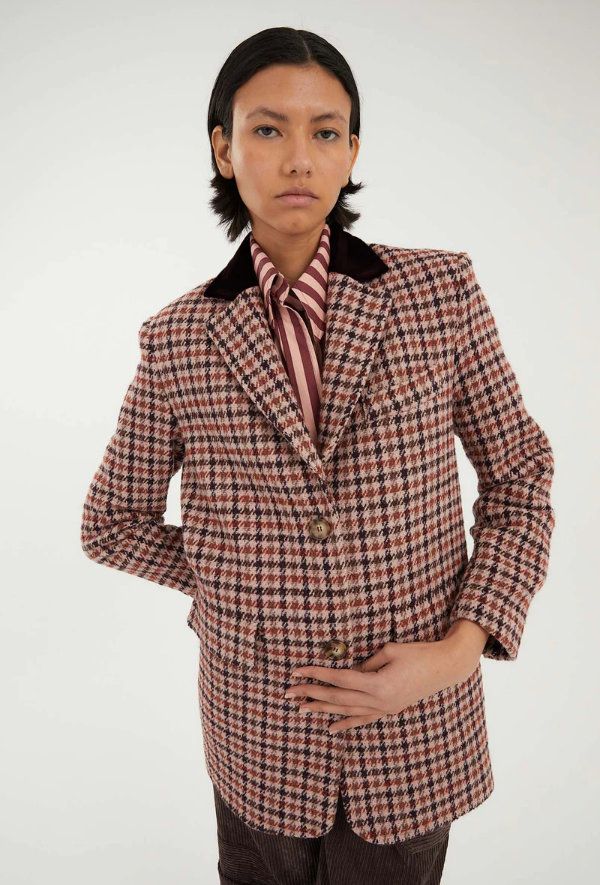 Se trata de una pieza que recupera del pasado año, pues esta americana con pequeñas figuras abstractas de cuatro puntas, la estrenó en noviembre de 2022. Un modelo de la marca española Sophie and Lucie con hombreras, solapas y ajuste en cintura, que entonces combinó con un jersey blanco de cuello alto y pantalón de pana. Y aunque esta chaqueta ya no se encuentra disponible en tiendas, sí está a la venta su versión actualizada: una blazer del mismo corte y estampado, pero en color rosa y burdeos, bautizada como Top Super Harris (249,95 euros).