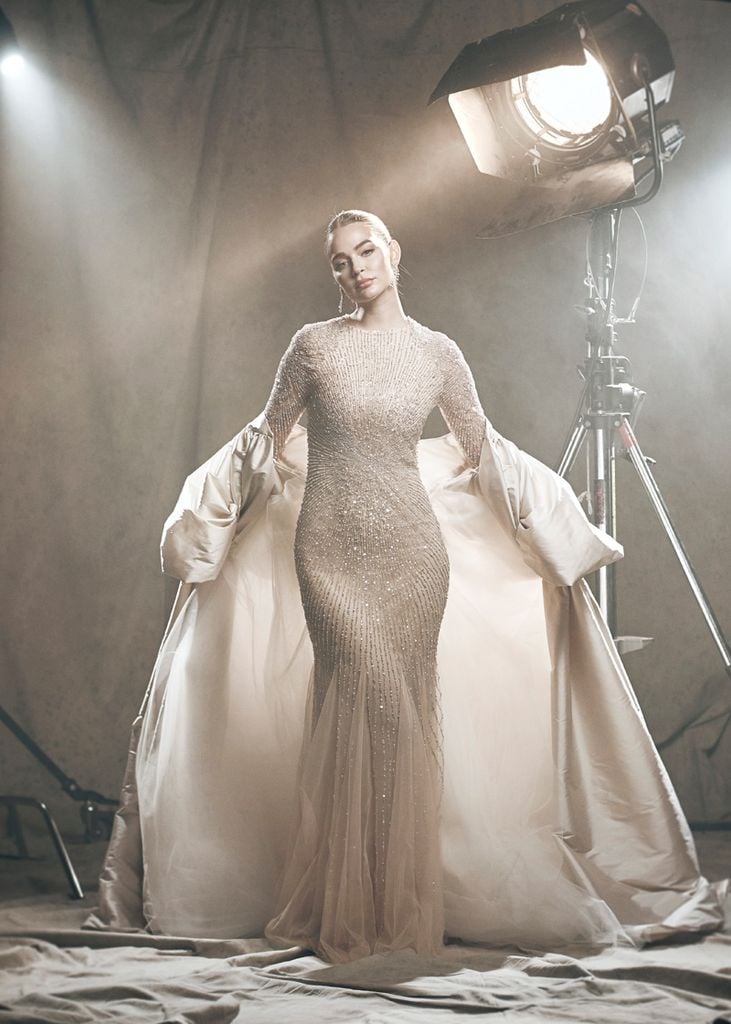 El conjunto está protagonizado por un vestido a medida confeccionado en tul bordado de pedrería en tonalidades champagne, perla y cristal, un tejido adornado a mano con un degradado radial que nace desde el centro de la cintura y se difumina por el cuerpo. Cuenta con silueta entallada y manga larga, y está acompañado, para una mayor teatralidad, de un voluminoso abrigo oversize con corte canesú, manga abullonada y maxicola en tafetán y tul.