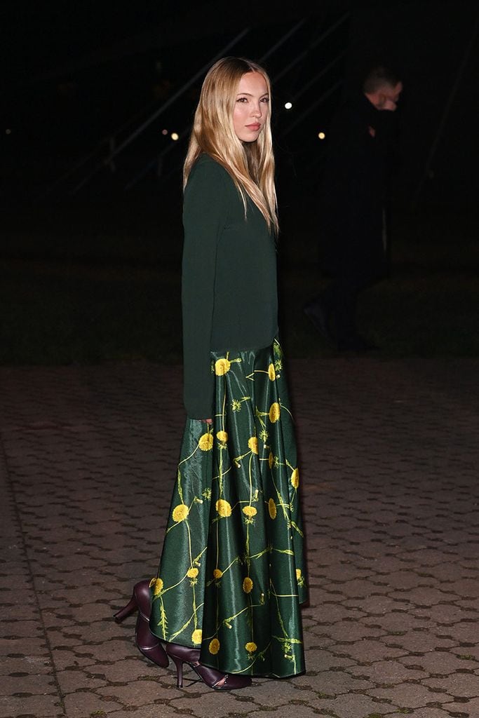 Esta vez ha acudido en calidad de invitada VIP al desfile de Burberry en el marco de la semana de la moda de Londres. La promesa de la industria se ha mostrado enfundada en un vestido que parece un conjunto de dos piezas y que podemos copiar con un suéter sobre un vestido largo o una falda. Un diseño de la mencionada firma que tiene doble textura porque está conformado por un cuerpo en punto acanalado de cuello redondo y mangas largas y una falda de bajo asimétrico en raso con print de dientes de león a contraste.