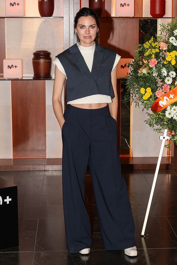 La actriz de Velvet ha aparecido en el photocall estrenando un original traje de chaqueta, es decir, ha versionado esta combinación clásica y relacionada tradicionalmente con el armario masculino, con una opción mucho más divertida a partir de una chaleco de rayas diplomáticas muy crop. Se trata de una prenda un tanto controvertida, que amas u odias, pero que la Generación Z ha popularizado convirtiéndola en todo un sello de identidad entre su target. Amaia lo ha completado con una camiseta blanca de algodón, también cortita, con la que presume de abdominales y pantalones fluidos de talle alto que esconden unas botas blancas de tacón, puntera cuadrada y acabado acharolado.