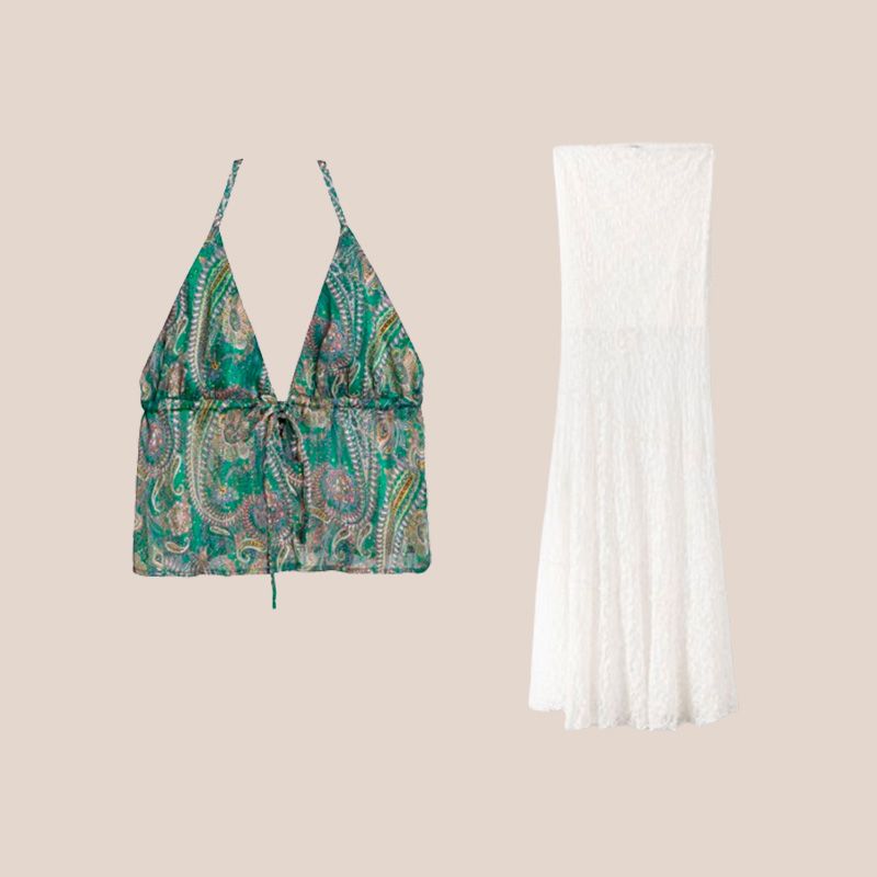 Ficha en The Are este top estampado con lazada al cuello y espalda al descubierto (44,95 31,95 euros) y combínalo con una falda midi con encaje de Bershka (25,99 euros).