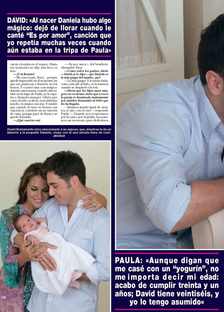 Como padres primerizos, la pareja afirmaba durante la entrevista de José Antonio Olivar que el cuidado de la pequeña se había convertido en el eje sobre el que giraban sus vidas pero que también buscaban un espacio, aunque fuese pequeño, al día, para estar juntos y seguir manteniendo vivo su matrimonio. “Estamos siendo igual de atentos el uno con el otro -decía Paula-. Cuando nos tropezamos por la casa o por el jardín, nos paramos un momento para dedicarnos un beso o un abrazo. De acuerdo que Daniella es la reina de la casa, pero no hay que olvidar que si está aquí es por nosotros. Por lo tanto, quienes siempre tenemos que estar bien somos David y yo”.