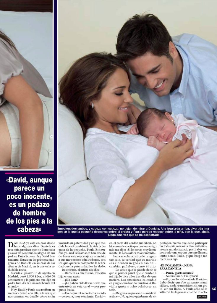 Al igual que ha ocurrido ahora con su segundo hijo, Miguel Jr., nacido de su relación con el exfutbolista Miguel Torres, el primer embarazo de Paula Echevarría fue seguido por los medios de comunicación casi día a día hasta el momento del parto. Daniella, la hija de David Bustamante y Paula, una niña preciosa que no lloraba nada y causó la alegría de sus padres, llegaba al mundo el dieciocho de agosto de 2008. Días después, ya con la niña en su casa de las afueras de Madrid y emocionados ambos, la pareja presentaba a su hija ante las cámaras en atención a sus numerosos admiradores, con los que quisieron compartir la felicidad que la paternidad les había dado. Para ello posaban en exclusiva para la revista ¡HOLA! junto a la recién nacida que era, según su padre, “la niña más bonita del mundo”.