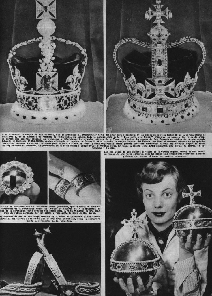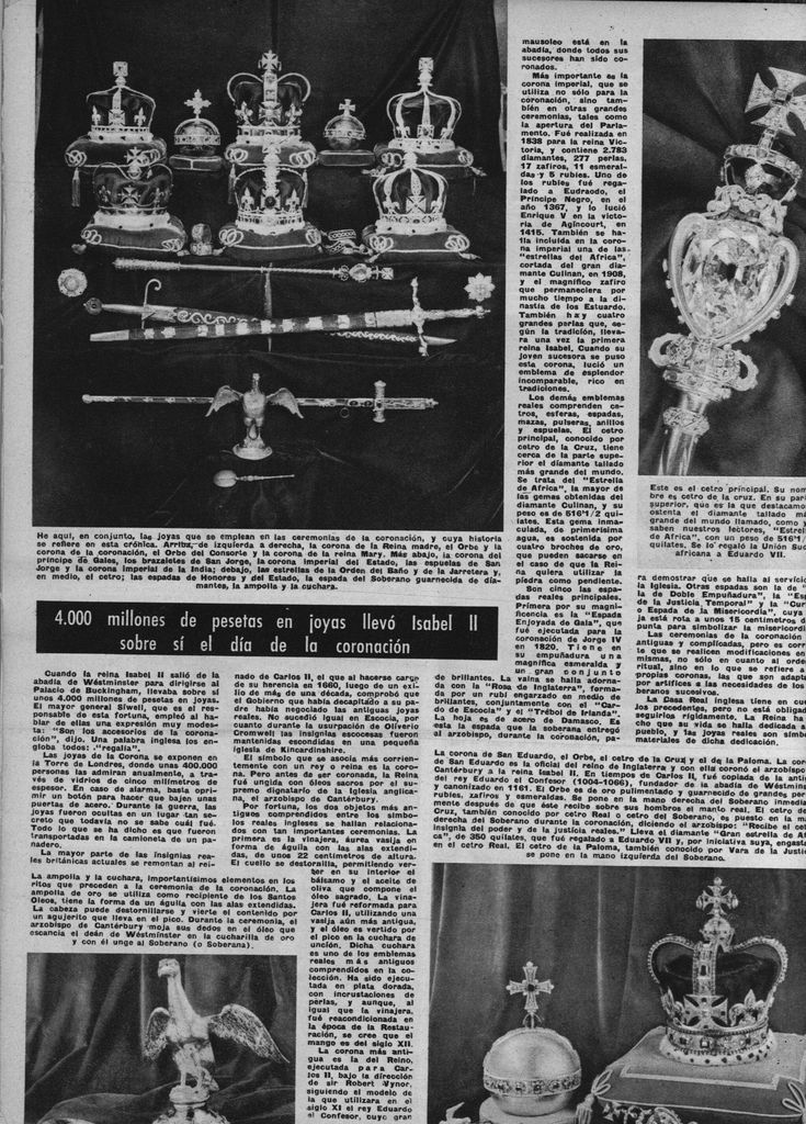 “Cuando la reina Isabel II salió de la abadía de Westminster para dirigirse al palacio de Buckingham llevaba sobre sí unos 4000 millones de pesetas en joyas”, reza la crónica de ¡HOLA! En nuestros tiempos, esta cifra equivaldría a más de 24 millones de euros en unas piezas con gran valor histórico, como un collar, del que cuelga una lágrima de 22 quilates, unos pendientes, con 25 brillantes, herencia de la reina Victoria (que la Reina volvió a lucir con motivo de su Jubileo de Diamante), y los brazaletes reales que llevan los soberanos desde tiempos de Eduardo VI. El anillo de la coronación, hecho también para su predecesora, llevaba una gran cruz de rubíes coronada por un zafiro; y las espuelas de oro de San Jorge, símbolo de la Orden de Caballería, fueron puestas en los talones de la Reina por el lord Gran Chambelán, como es costumbre desde tiempos de la reina Ana.