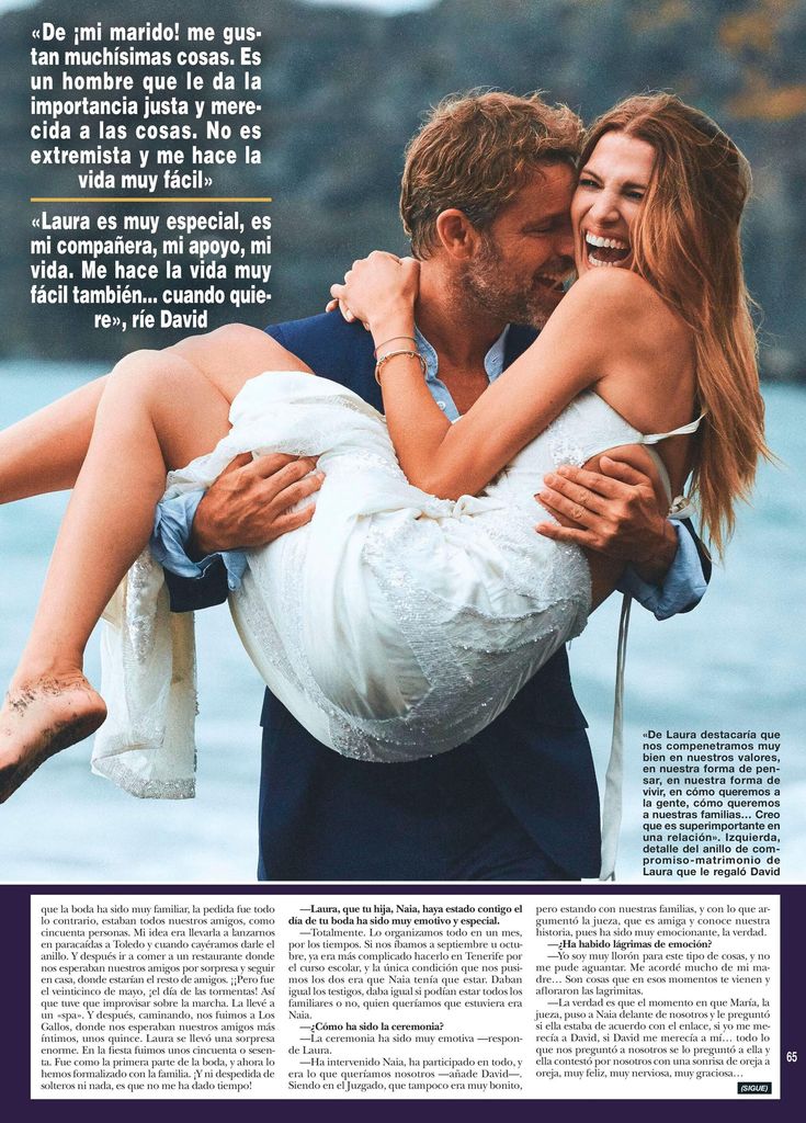 “La verdad es que el momento en que María, la jueza, puso a Naia delante de nosotros y le preguntó si ella estaba de acuerdo con el enlace, si yo me merecía a David, si David me merecía a mí... todo lo que nos preguntó a nosotros se lo preguntó a ella y ella contestó por nosotros con una sonrisa de oreja a oreja, muy feliz, muy nerviosa, muy graciosa...”, añadía Laura. La modelo escogió para el gran día un conjunto dos piezas: un pantalón y un top, blancos, de Carolina Herrera, que combinó con unos zapatos de Jimmy Choo y pendientes y pulseras de Bárcena. Después, cambió su look por un vestido de Temperley London, con abertura lateral y la espalda casi al descubierto.