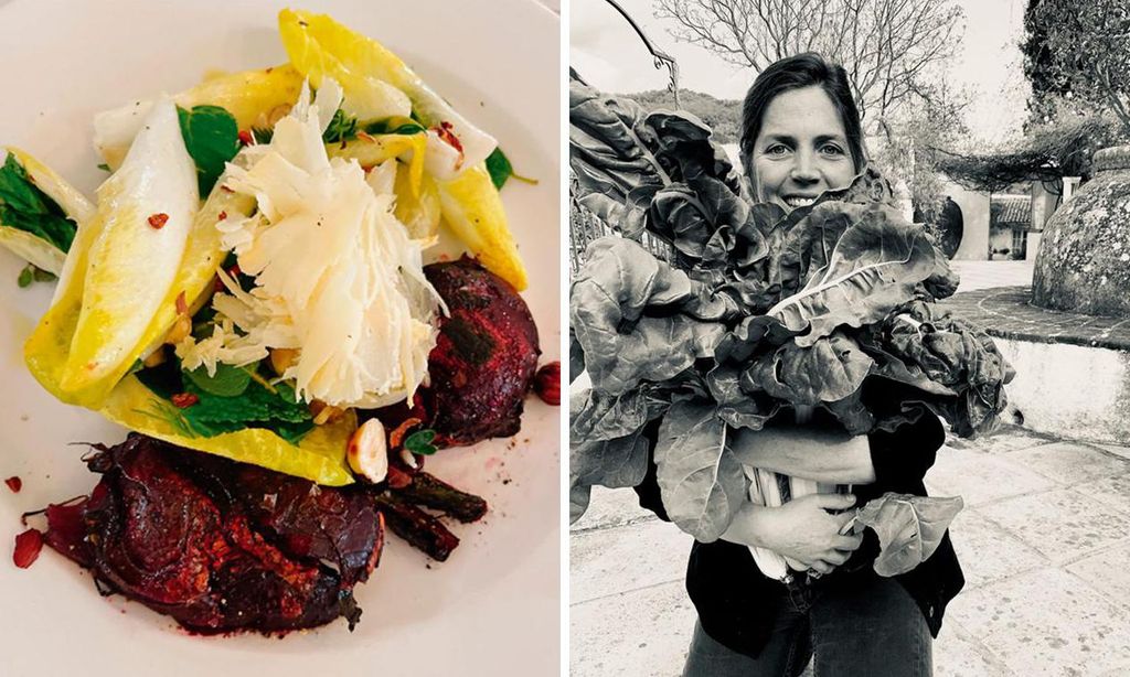 larga vida al buen comer: Remolacha a la plancha, endivia, naranja, avellanas tostadas y lascas de queso añejo (izda.) y Gioconda Scott (dcha.), sosteniendo producto fresco.