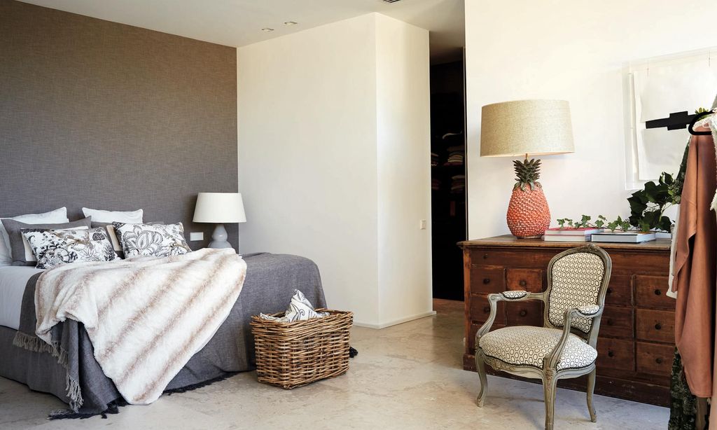 - Quietud cromática. La paz de un entorno rodeado de vegetación se traslada al interior mediante tonos marrones y pinceladas de verde.