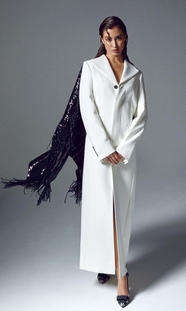 La modelo hispano-marroquí, que a la izquierda aparece con abrigo con capa de lentejuelas, de Duarte, y zapatos, de Inés Domecq by Cuplé.