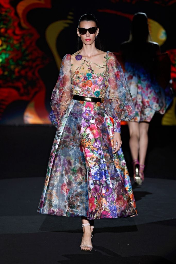 Para Primavera/Verano 2025, Hannibal Laguna presenta Soundflourish, una colección que se inspira en las flores y el renacer del sol. Vemos creaciones que volúmenes alegres en organza y gasa, estampados de efecto acuarela y siluetas que definen las cinturas y esculpen las caderas. En cuanto al color, busca ricos contrastes, por ejemplo, con tonos neutros junto empolvados.